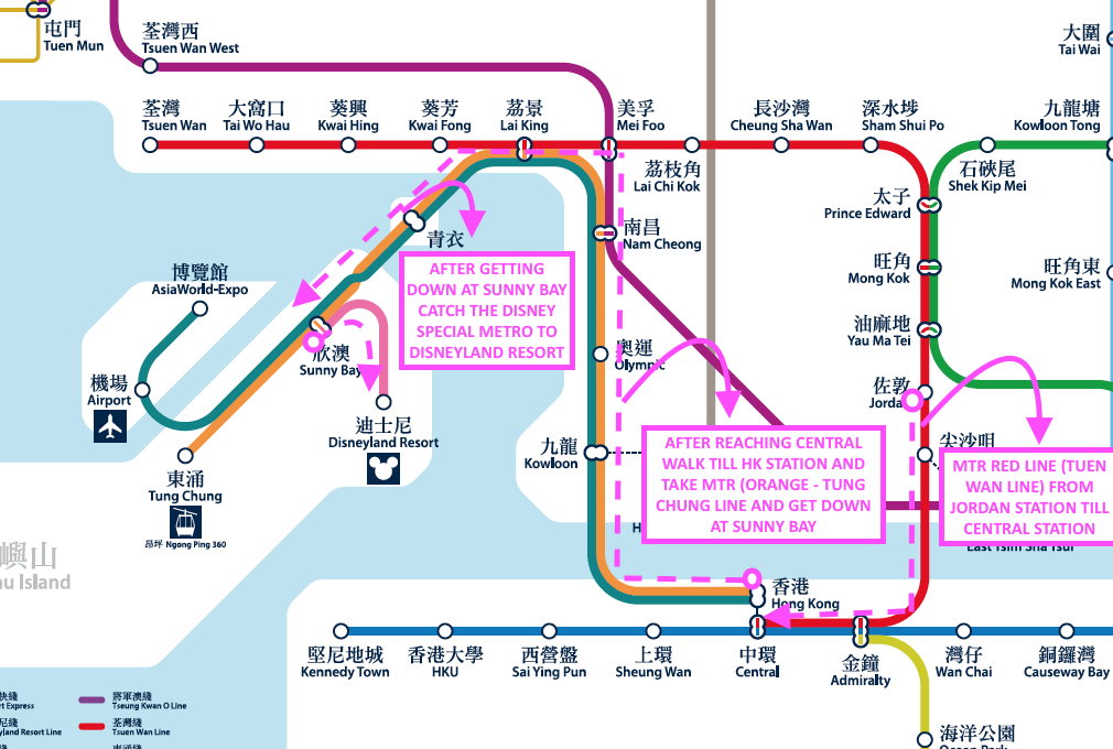 We took a subway to reach Disneyland, which was quite simple. We took the subway from Jordan Station to Central Station (Red Line – Tsuen Wan line) and from Central we walked till the HK Station. From HK station we went to Sunny Bay Station (Orange line – Tung Chug line) from where runs a Disney special train directly to the Disneyland Resort. Round trip ticket to Disneyland costs 45 HKD.